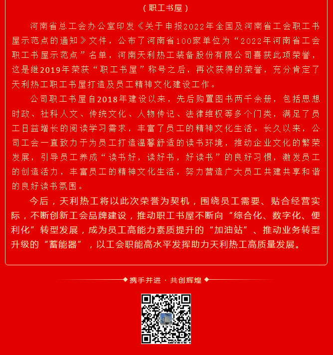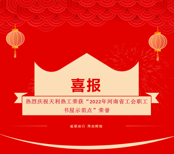 喜报:热烈庆祝天利热工荣获“2022年河南省工会职工书屋示范单位” 更新时间:2022-11-16 点击次数:1549次